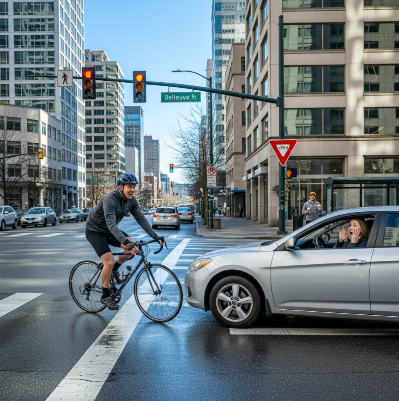 Imagine a cyclist heading eastbound on NE 4th Street with a green light. A driver turning left from Bellevue Way fails to yield and collides, causing a fractured pelvis and concussion.