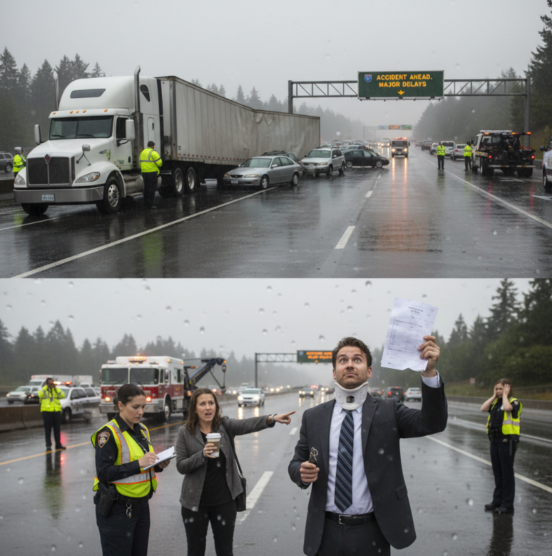 Picture a rainy morning commute on I-90 near Bellevue. A semi-truck driver traveling too fast for the wet conditions brakes suddenly as traffic slows. The trailer swings left, blocking three lanes. Multiple vehicles collide with the trailer, causing serious injuries.